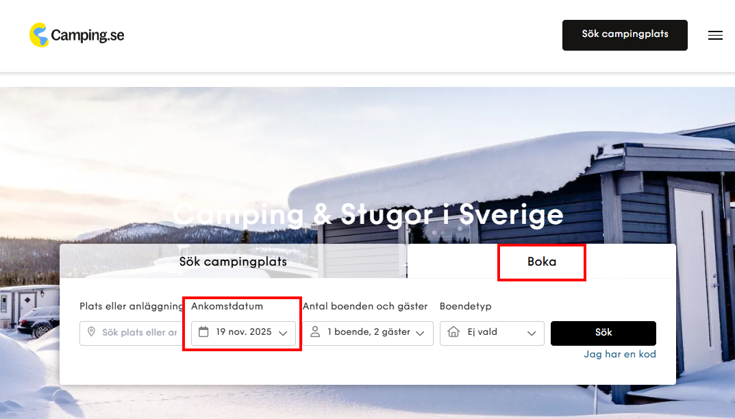 Du kan också använda vårt sökformulär för att välja att endast söka efter campingplatser som är öppna när du söker boende genom alternativet "Boka Boende" och söka efter önskad ankomstdatum.